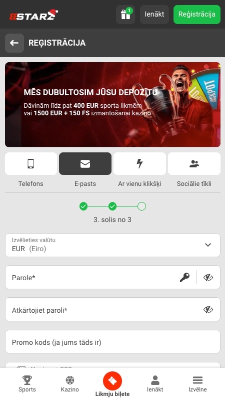 mobilajÄ versijÄ pieejamas tÄs paÅ”as funkcijas, kas datorÄ – kazino, sports, iemaksas/izmaksas, bonusi u.c.