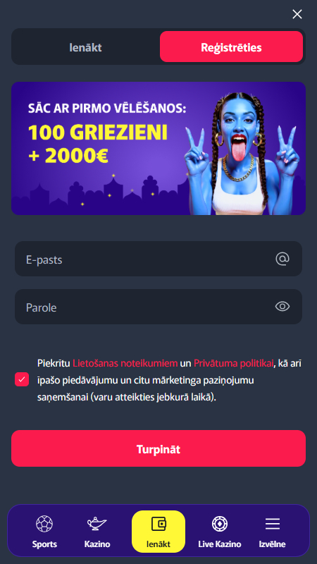 Vidēji reģistrācija aizņem līdz 5–7 minūtēm. Pēc konta izveides iespējams uzreiz veikt iemaksu un aktivizēt starta piedāvājumu.
