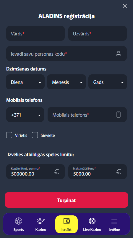 Aladins reģistrācija ir pilnībā digitāla un atbilst Latvijas regulējumam, kas nozīmē, ka anonīma spēlēšana nav iespējama. Konta izveides laikā jānorāda patiesi personas dati, jo tie vēlāk tiks izmantoti verifikācijai un izmaksu apstrādei.