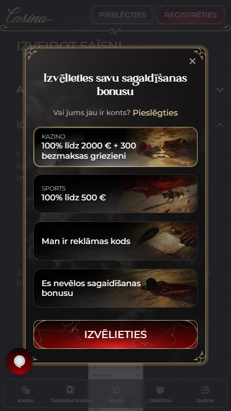 ReÄ£istrÄcijas vai pirmÄ depozÄ«ta laikÄ spÄlÄtÄji var izvÄlÄties aktivizÄt kazino piedÄvÄtos bonusus.
