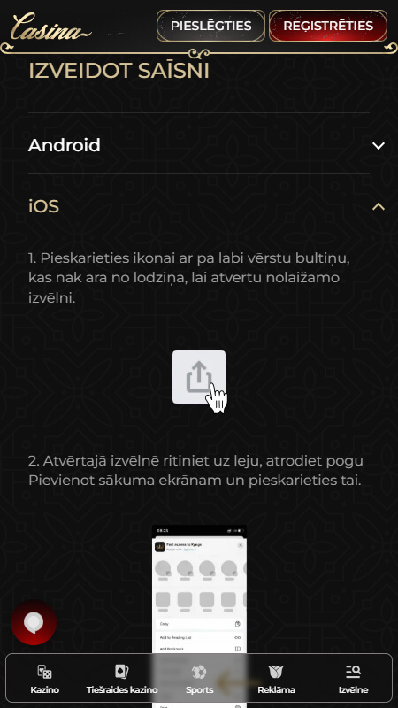 Casina kazino nepiedÄvÄ atseviŔķu iOS vai Android aplikÄciju. Platforma darbojas kÄ pilnÄ«bÄ optimizÄta mobilÄ web versija, kas pieejama pÄrlÅ«kprogrammÄ.