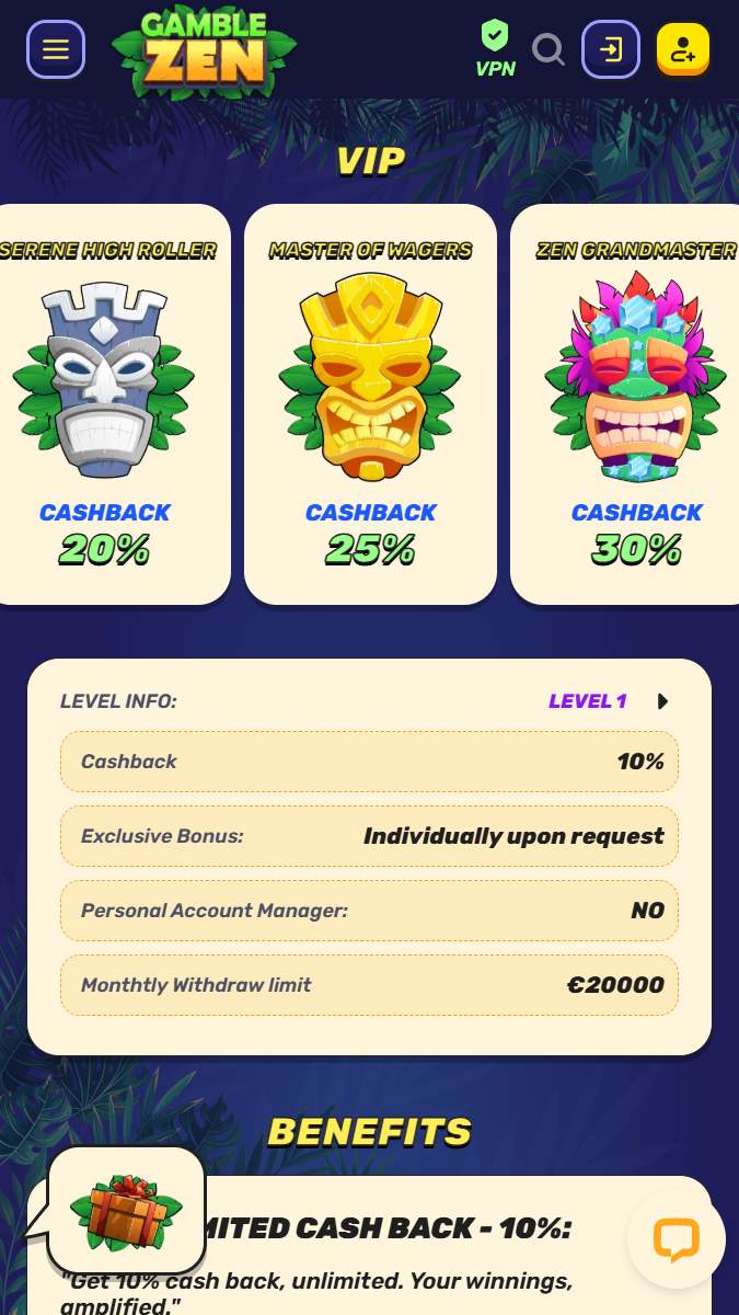 GambleZen rÅ«p savi lojÄlÄkie spÄlÄtÄji ā tieÅ”i tÄpÄc te darbojas arī VIP programma, kas sniedz arvien iespaidÄ«gÄkas priekÅ”rocÄ«bas, kÄpjot pa lÄ«meÅiem uz augÅ”u. Jo augstÄks statuss, jo lielÄki ieguvumi:Ā palielinÄts cashback (no 10% lÄ«dz pat 30%), ekskluzÄ«vi bonusi, personÄ«gais konta menedžeris, ÄtrÄkas un lielÄkas izmaksas, kÄ arÄ« vÄl virkne privilÄÄ£iju.