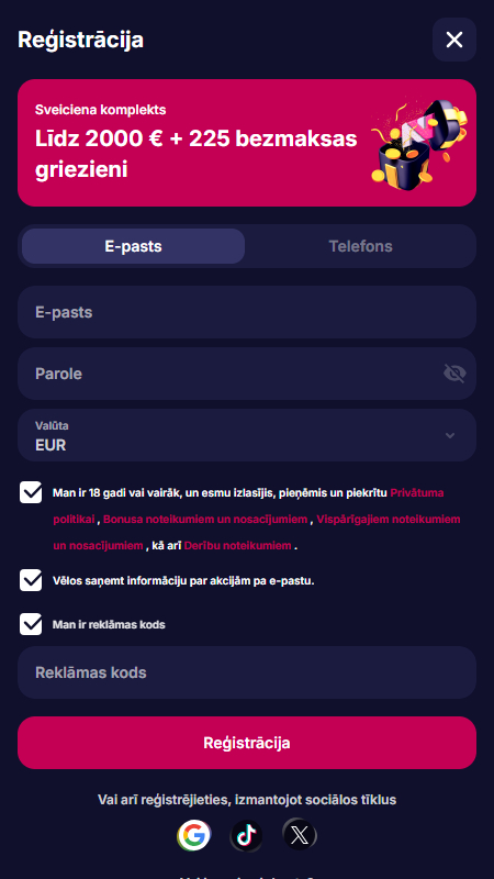 Iepazīšanās bonuss līdz 2 000 € + 225 bezmaksas griezieni