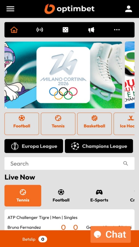 Optimbet piedÄvÄ atseviŔķu sporta likmju sadaļu ar vairÄk nekÄ 20 000 live notikumiem un 50+ likmju veidiem katram notikumam. Pieejamas tÄdas disciplÄ«nas kÄ futbols, teniss, basketbols, cÄ«Åas sporti un e-sports.