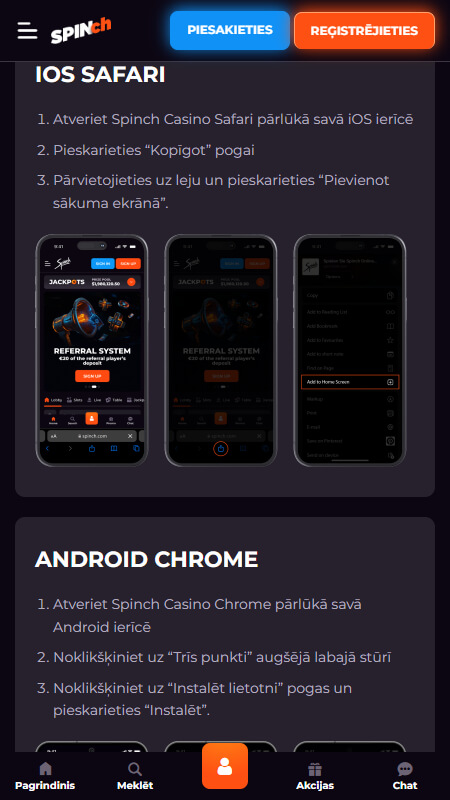 Spinch mobilÄ vietne ir pieejama caur jebkuru modernu pÄrlÅ«kprogrammu (Chrome, Safari, u.c.), un nav nepiecieÅ”ama papildu programmatÅ«ras instalÄcija.