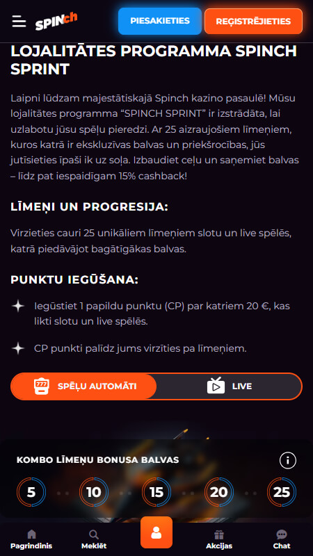 AttÄ«stÄ«ta lojalitÄtes programma: 25 lÄ«meÅu Spinch Sprint sistÄma ar progresÄjoÅ”iem cashback procentiem, lÄ«meÅa balvÄm un augstÄkiem izmaksu limitiem.
