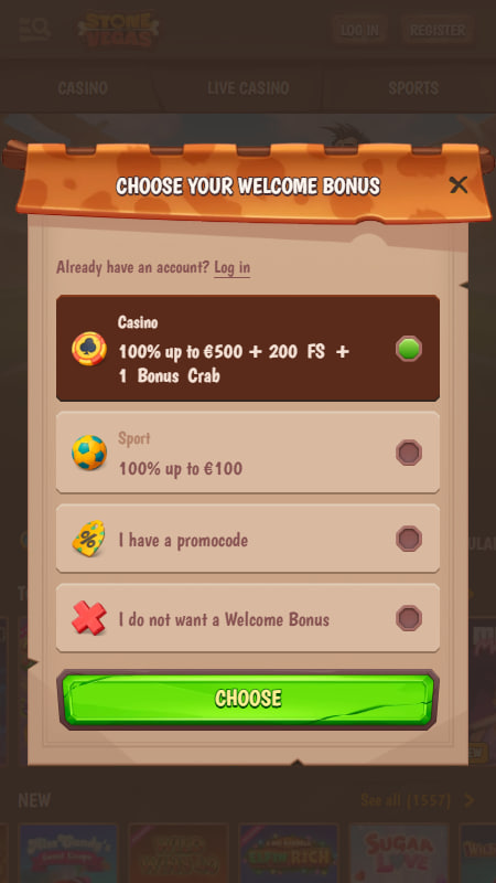 StoneVegas jaunajiem spÄlÄtÄjiem piedÄvÄ vienkÄrÅ”u pirmÄ depozÄ«ta bonusu, ko var aktivizÄt jau reÄ£istrÄcijas brÄ«dÄ« vai pÄc tam savÄ profilÄ. Bonusa apmÄrs ir atkarÄ«gs no pirmÄs iemaksas summas, un tam pievienoti arÄ« bezmaksas griezieni.