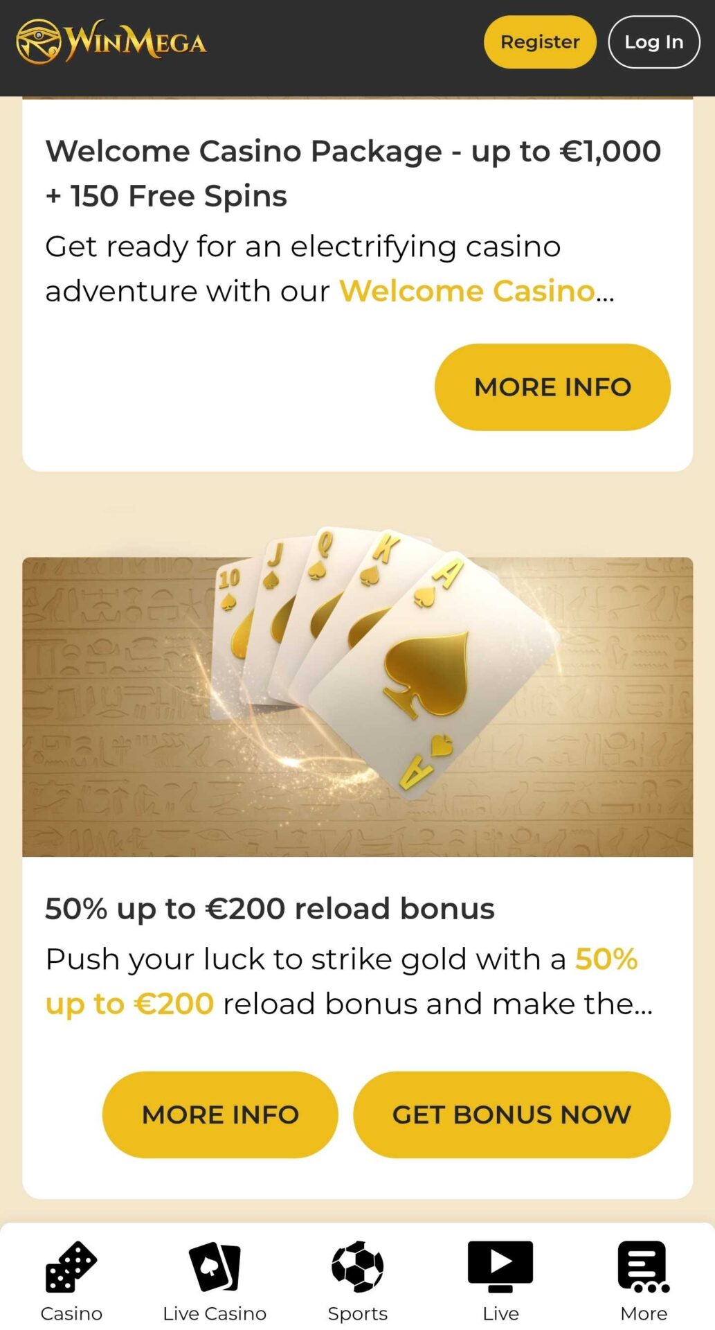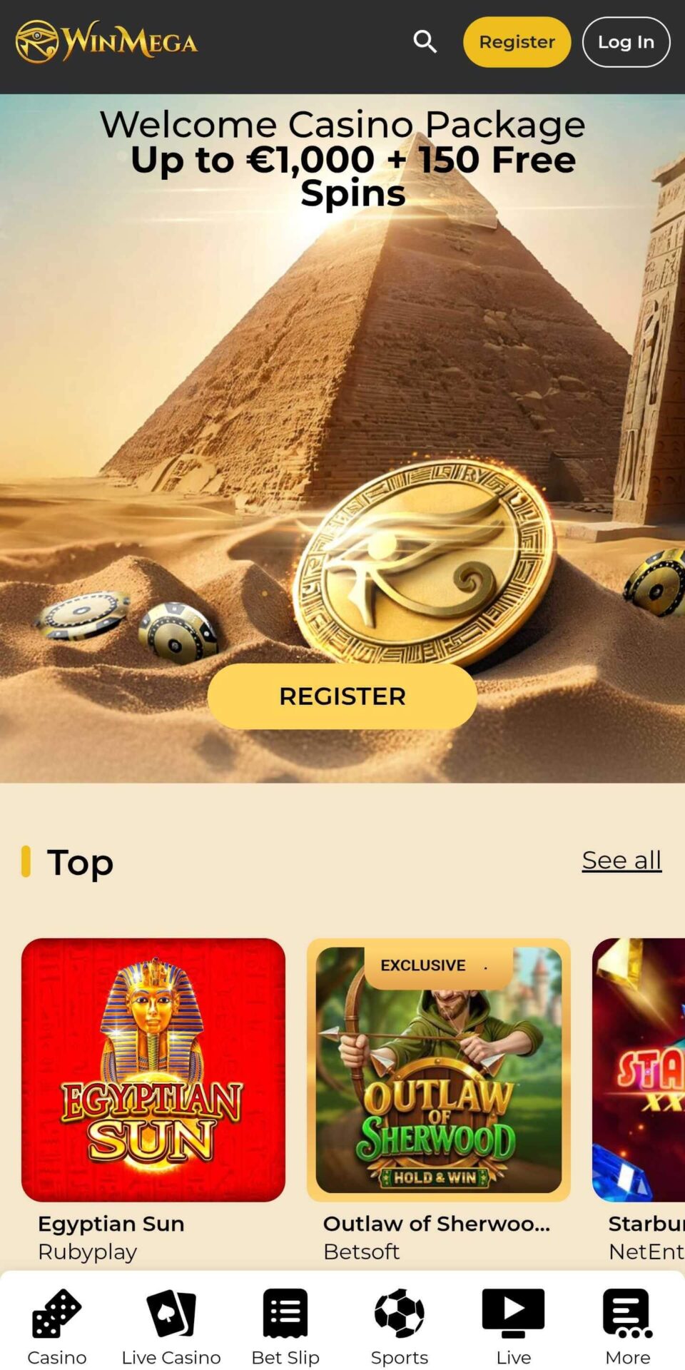 WinMega kazino pozicionÄ sevi kÄ bonusu orientÄtu online kazino ar izteiktu fokusu uz daudzpakÄpju welcome paketi un regulÄrÄm akcijÄm. PiedÄvÄjums lÄ«dz ā¬1,000 + 150 bezmaksas griezieni, kÄ arÄ« 50% reload bonuss un ikmÄneÅ”a bezmaksas griezieni veido platformas galveno mÄrketinga struktÅ«ru.