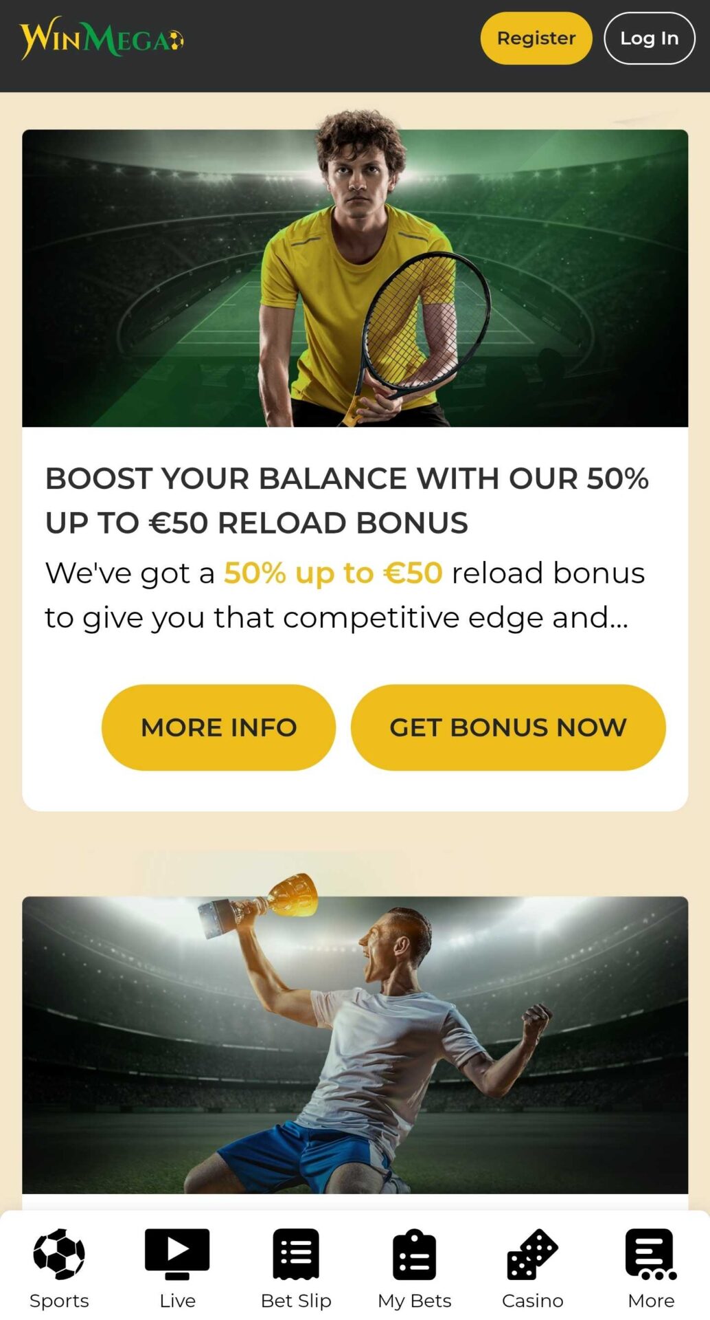 WinMega piedÄvÄ Äetru depozÄ«tu iepazīŔanÄs paketi lÄ«dz ā¬1,000 + 150 bezmaksas griezieni. Katram depozÄ«tam tiek pieŔķirts noteikts procentuÄls bonuss un bezriska griezieni konkrÄtos spÄļu automÄtos. Lai izÅemtu laimestu, bonuss un depozÄ«ts jÄapgroza 40Ć. MaksimÄlais laimests no bonusa ir 10Ć no saÅemtÄs bonusa summas.