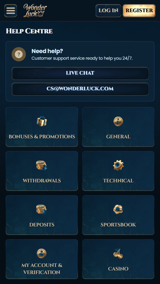 WonderLuck nodroÅ”ina klientu atbalstu 24/7 režīmÄ, izmantojot vairÄkus saziÅas kanÄlus.