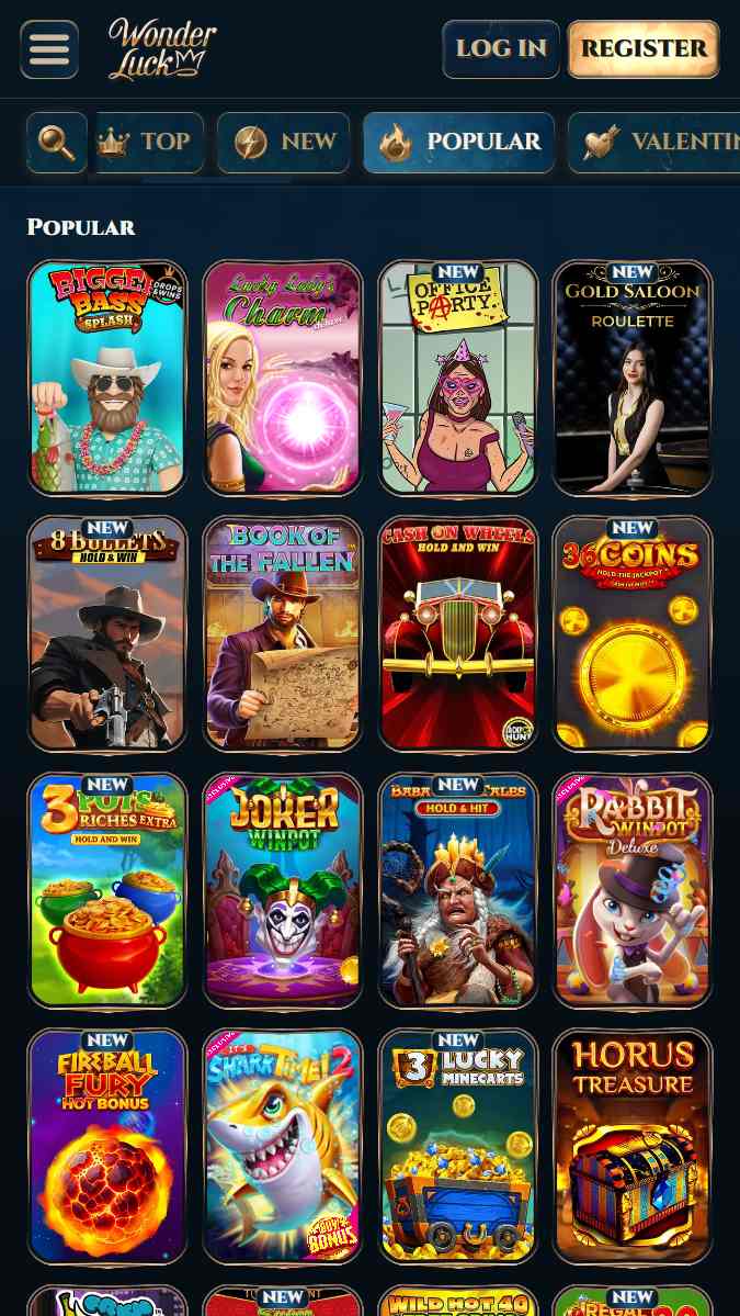 WonderLuck kazino spÄles aptver plaÅ”u tieÅ”saistes kazino segmentu ā video slotus, galda spÄles, Live kazino, jackpot spÄles, kÄ arÄ« crash un instant formÄta spÄles. Platforma ir strukturÄta vairÄkÄs kategorijÄs (Casino, Live Casino, Jackpots), nodroÅ”inot pÄrskatÄmu navigÄciju un Ärtu piekļuvi dažÄdiem spÄļu veidiem.