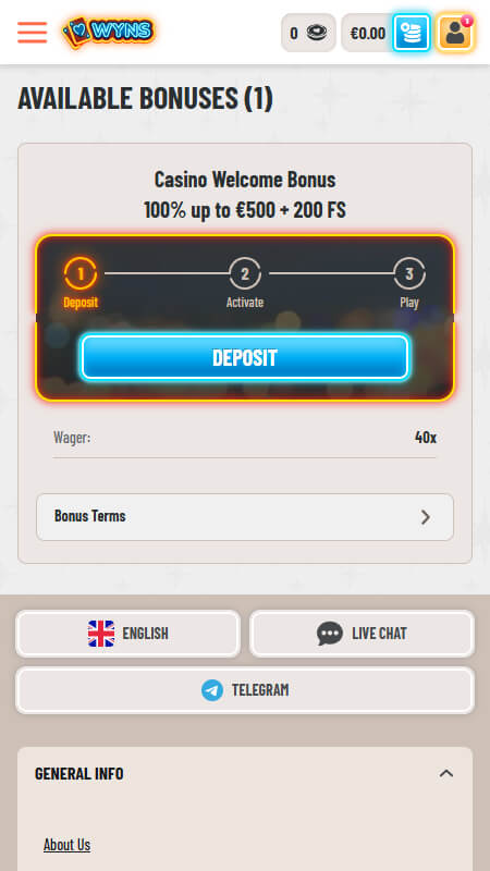 Wyns ir starptautisks tieÅ”saistes kazino un sporta totalizators, kas piedÄvÄ vienotu platformu kazino spÄlÄm, Live kazino un sporta likmÄm. Platforma piedÄvÄ plaÅ”u bonusu sistÄmu, tostarp 100% welcome bonusu lÄ«dz ā¬500 + 200 bezmaksas griezienus un 200% kriptovalÅ«tu bonusu lÄ«dz 3,000 USDT. Kazino pieejamas vairÄk nekÄ 8000 spÄles – video sloti, jackpot spÄles, Live kazino galdi un Instant Games. Pieejami arÄ« reload bonusi, cashback, kazino izaicinÄjumi, Bonus Crab mini spÄle un VIP programma. Platforma atbalsta e-makus, bankas pÄrskaitÄ«jumus un kriptovalÅ«tas, bet minimÄlais depozÄ«ts ir ā¬10.