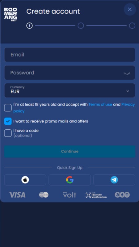 Заполните адрес электронной почты и выберите пароль. На первом шаге введите свой email и придумайте надежный пароль. Выберите валюту аккаунта и подтвердите свое согласие с условиями сайта, затем нажмите «Continue».