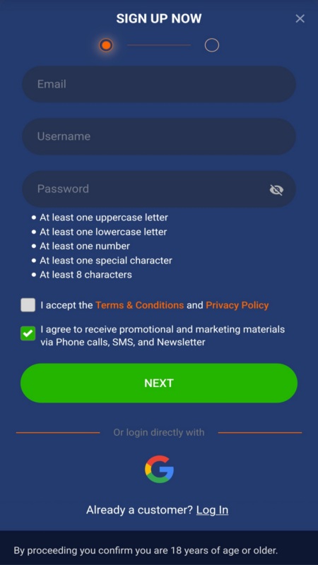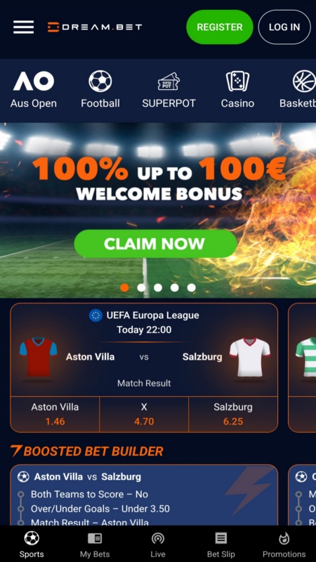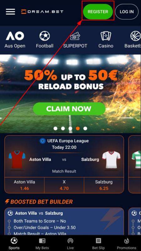 Перейдите на сайт Dream Bet и нажмите «Register». Выберите желаемый бонус (казино или спортивные ставки).