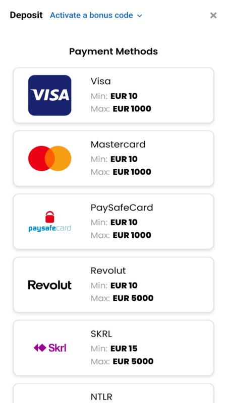 Обычно минимальный депозит составляет 10 €. Точная сумма может зависеть от выбранного способа оплаты.
