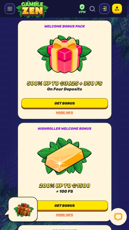 GambleZen умеет привлекать внимание — бонусы здесь действительно впечатляющие. Новые игроки могут начать свой путь с особенно щедрого приветственного предложения, которое в сумме даёт до €3625 и 350 бесплатных вращений на первых депозитах.