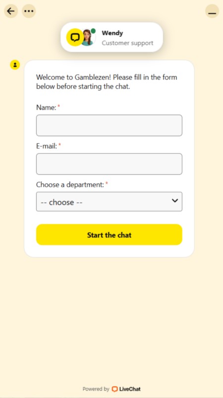 GambleZen предлагает несколько удобных способов связи со службой поддержки. Клиентский сервис отзывчивый и компетентный, однако стоит отметить важный момент — поддержка не работает на латышском языке, даже с помощью автоматического переводчика. Если вы не уверены в английском, русском или немецком, это может создать некоторые неудобства.