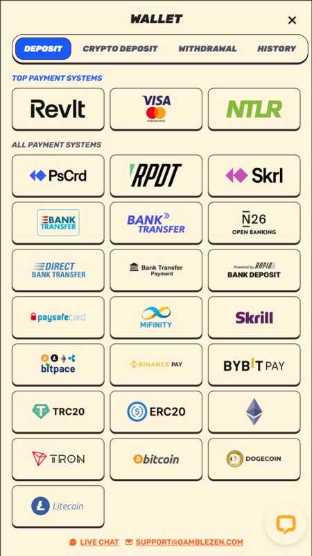GambleZen поддерживает очень широкий набор платёжных вариантов, чтобы вы могли выбрать наиболее удобный способ — карты Visa и Mastercard, Paysafecard, Skrill, Neteller, Rapid Transfer, банковские переводы и, конечно, несколько криптовалют, включая Bitcoin, Ethereum и Litecoin.