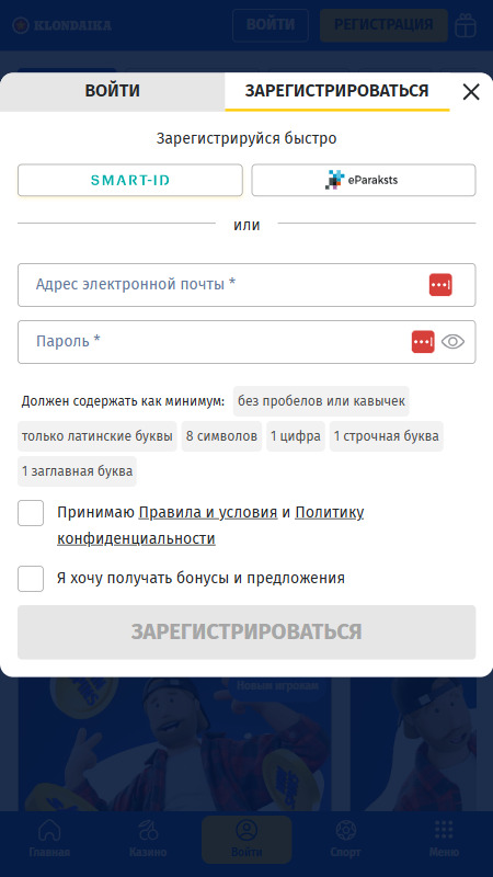 Регистрация в Klondaika