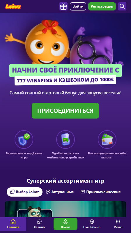 Laimz выделяется среди других онлайн-казино своей красочностью и весёлой атмосферой. Дизайн Laimz может показаться игривым или даже немного детским, но это неплохо, так как яркие цвета и интересный стиль помогают расслабиться и по-настоящему насладиться процессом.