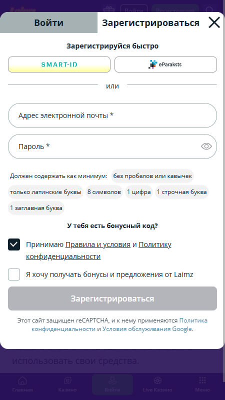 Выберите удобный способ регистрации Нажмите на кнопку регистрации, которую вы найдёте в нашем описании Laimz, а затем нажмите «Зарегистрироваться». Далее вам нужно будет выбрать способ регистрации: стандартная версия или через Smart-ID.