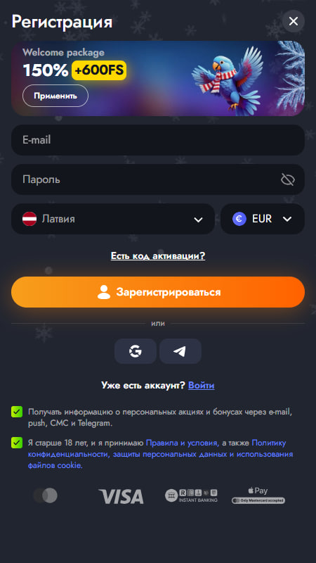 Главный плюс — стартовый бонус для новых игроков. Он состоит из двух частей: 150% на первый депозит и до 600 фриспинов за второй депозит.