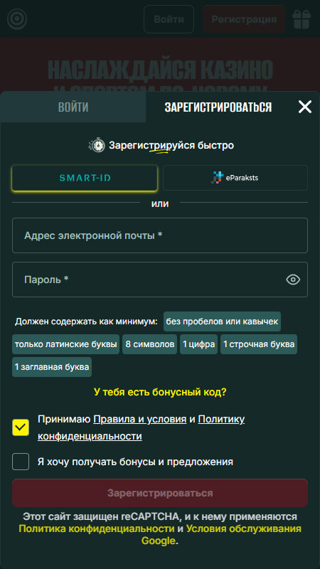 Заполните форму: Введите свой адрес электронной почты, создайте надёжный пароль и выберите, хотите ли вы получать бонусы.