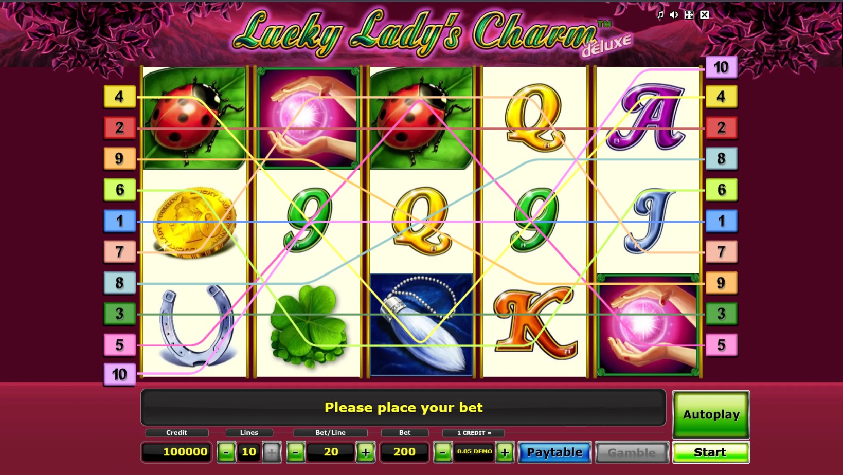 Lucky Lady’s Charm Deluxe — один из самых культовых игровых автоматов Novomatic за всё время. Этот видеослот 5×3 предлагает именно то, за что ценят классику Novomatic: простую, мощную и захватывающую игровую механику с понятными бонусами и отлично сбалансированной математикой.