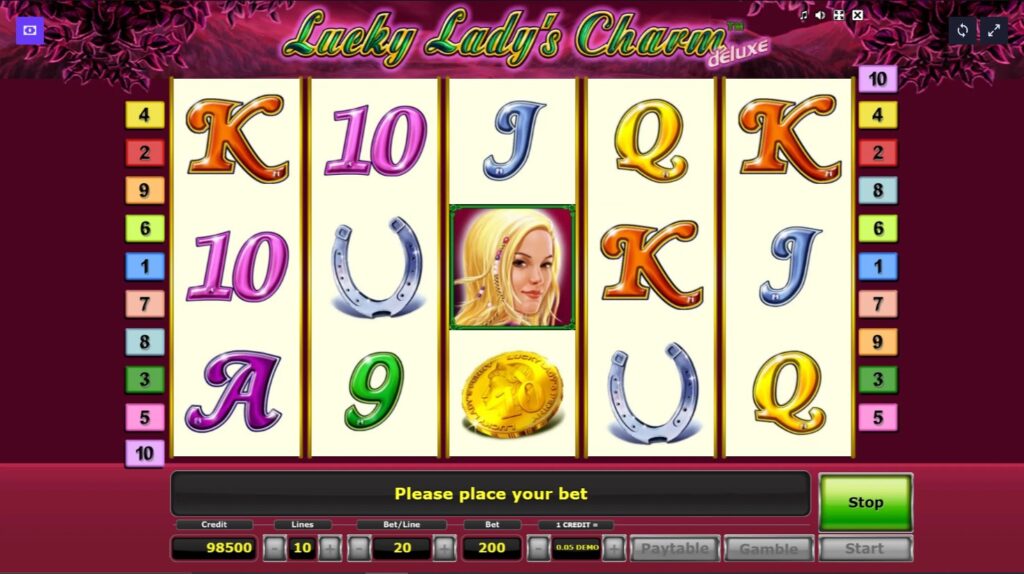 Lucky Lady’s Charm Deluxe — один из самых культовых игровых автоматов Novomatic за всё время. Этот видеослот 5×3 предлагает именно то, за что ценят классику Novomatic: простую, мощную и захватывающую игровую механику с понятными бонусами и отлично сбалансированной математикой.