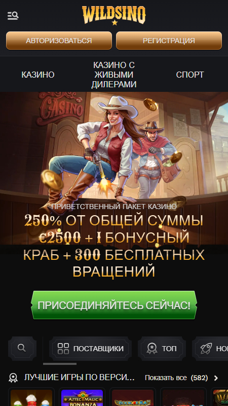 Среди множества онлайн-казино Wildsino выделяется тематическим оформлением и современным подходом к пользовательскому опыту. Дизайн казино выполнен в стиле «wild west» — тёмный фон, золотые и коричневые оттенки, анимированные элементы — это создаёт азартную, немного приключенческую атмосферу и помогает полностью погрузиться в игровой процесс.