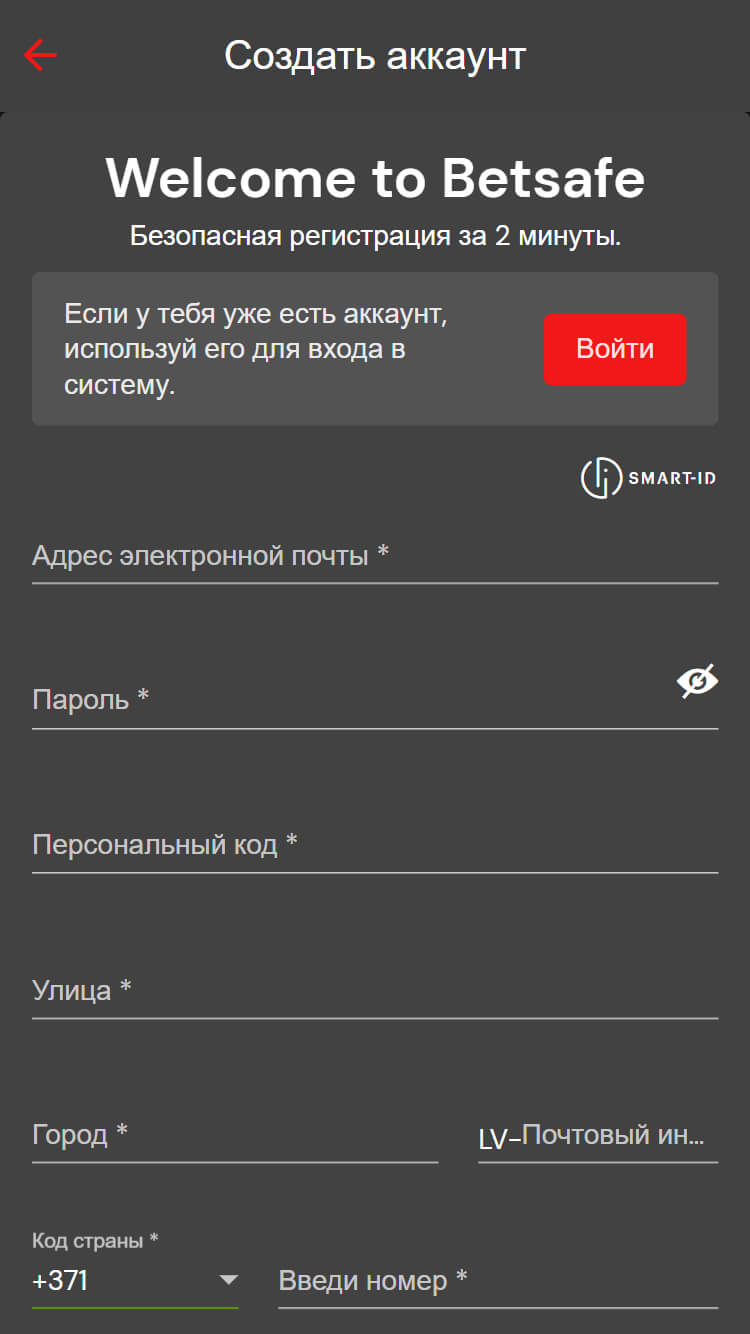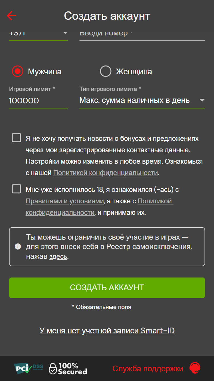 Заполните регистрационную форму. Укажите e-mail, придумайте пароль, введите персональный код, адрес, телефон, пол, игровой лимит. Подтвердите, что вы старше 18 лет, и согласитесь с Правилами и условиями. Нажмите на кнопку “Создать аккаунт”.