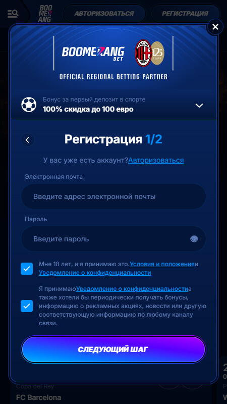 Регистрация в Boomerang Bet — это простой процесс, позволяющий создать учетную запись и получить доступ ко всем функциям платформы, включая бонусы и ставки. Следуйте инструкциям ниже, чтобы пройти регистрацию: