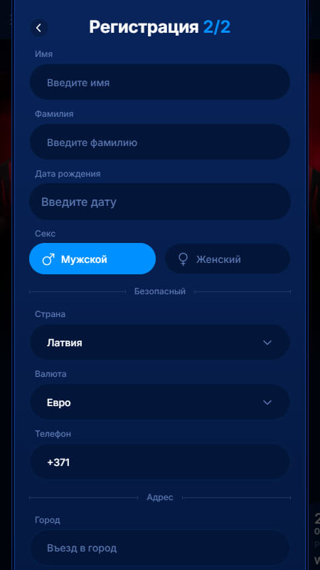 Заполните вторую часть регистрационной формы. Укажите личные данные: имя, фамилию, дату рождения, пол, страну проживания, валюту счета и контактный номер телефона. Также введите город, адрес и почтовый индекс.
