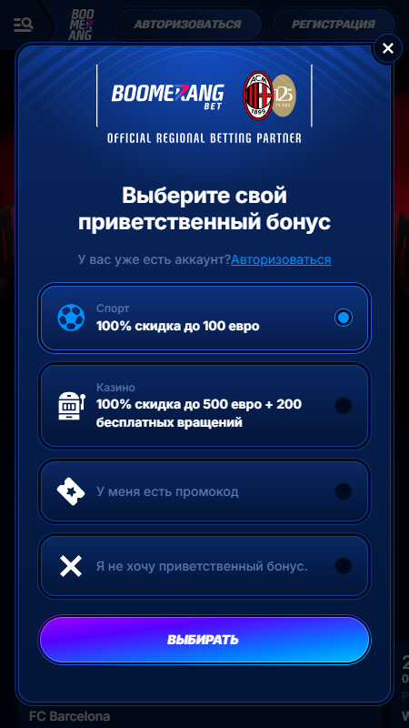 Регистрация в Boomerang Bet