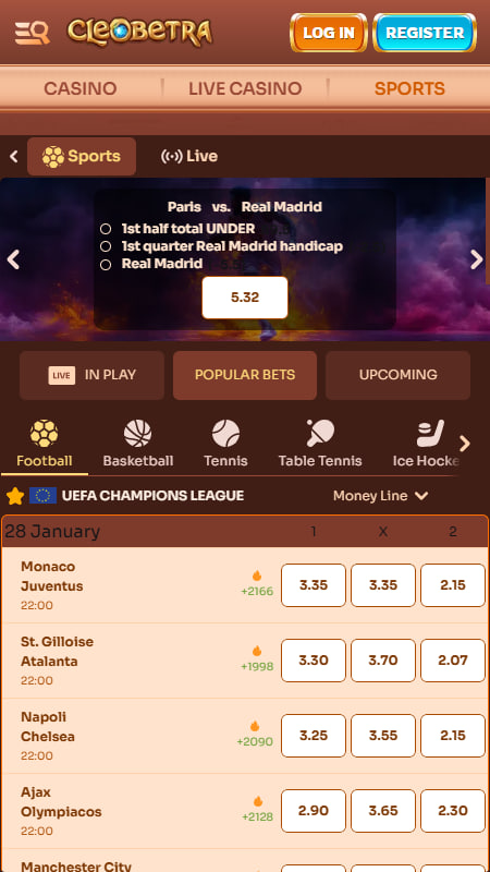 В спортивном разделе Cleobetra доступно около 30 видов спорта, включая футбол, баскетбол, теннис, хоккей, MMA, киберспорт и другие. Для каждого события имеется несколько десятков рынков ставок — от классических до live-ставок, а также такие функции, как Cash Out, повышенные коэффициенты и досрочная выплата (Early Payout). Платформа использует SSL-шифрование и обеспечивает безопасную обработку транзакций как с традиционными платёжными методами, так и с криптовалютами (Bitcoin, Ethereum, USDT и др.).