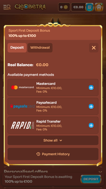 Cleobetra предлагает широкий выбор платёжных методов как для пополнения, так и для вывода средств, обеспечивая удобство и гибкость финансовых операций. Пополнения через большинство методов выполняются мгновенно.