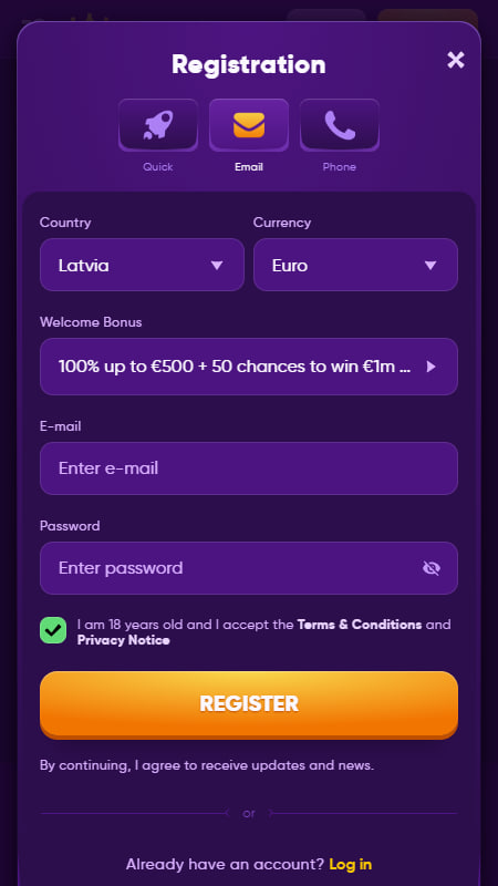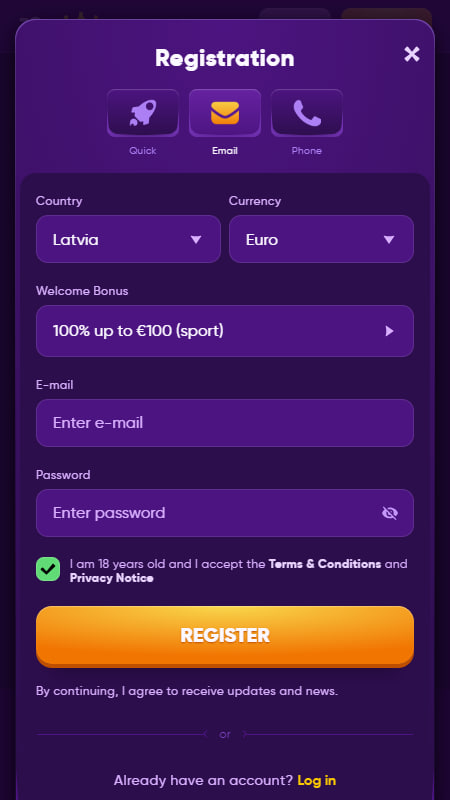 Выберите бонус, который хотите получить. Дальше заполните короткую форму: укажите e-mail, придумайте пароль, впишите имя, дату рождения и выберите удобную валюту.