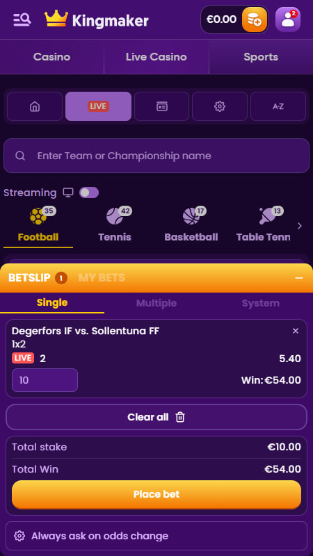 По скорости и стабильности мобильная платформа Kingmaker уверенно держится на уровне. Особенно это заметно в live-разделе, где у других букмекеров часто случаются подтормаживания. Стримов пока немного, но визуальная статистика и динамичные графики позволяют хорошо ориентироваться в происходящем на поле.
