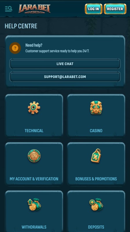Служба поддержки Ларабет ориентирована на международную аудиторию и оказывает помощь по вопросам, связанным с аккаунтом, платежами, бонусами и спортивными ставками.