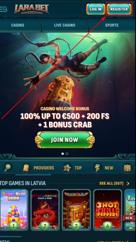Перейдите на официальный сайт Ларабет и на главной странице нажмите кнопку «Register».
