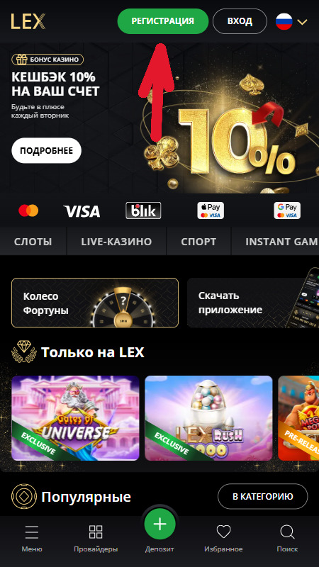 Регистрация в Lex Casino