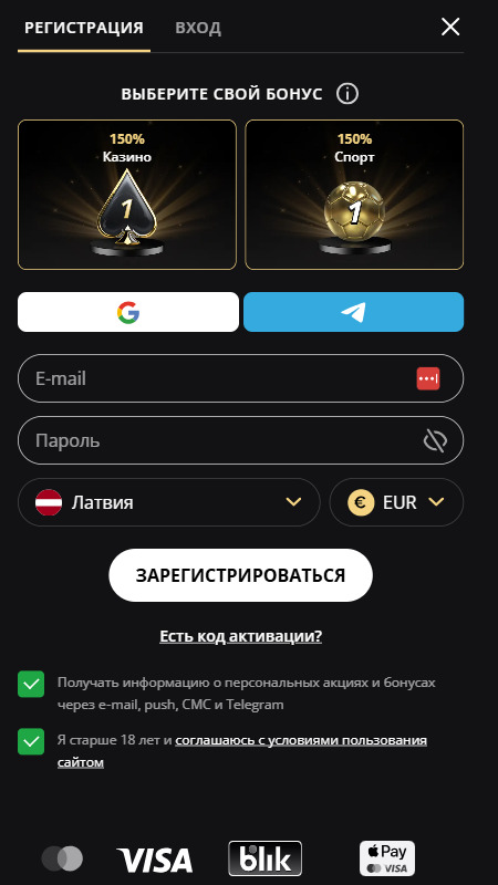 Появится окно с формой, где можно войти с помощью Google или Telegram, а также создать аккаунт, указав email, пароль, выбрав страну и валюту. Отметьте согласие с условиями и желаете ли вы получать бонусы.
