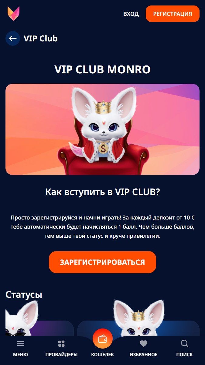 VIP-клиенты Monro получают дополнительные привилегии в отношении лимитов на вывод. Участники с уровня Elite могут снимать до 10 000 € в день, а владельцы статуса Supreme — без ограничений.
