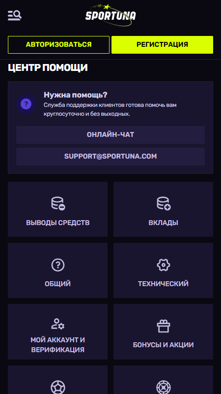 | 💬 Служба поддержки | 24/7 Live Chat и e-mail support@sportuna.com |