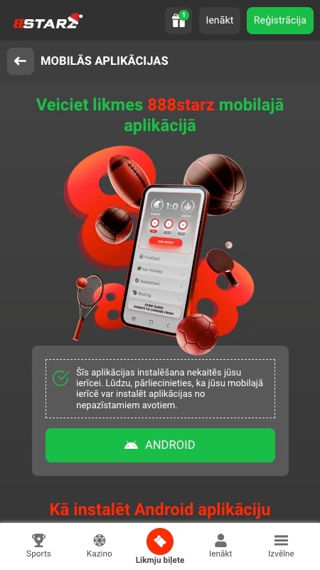 Android lietotne ir pieejama lejupielÄdei no oficiÄlÄs vietnes, piedÄvÄjot vÄl ÄtrÄku piekļuvi un push paziÅojumus par spÄlÄm un bonusiem.