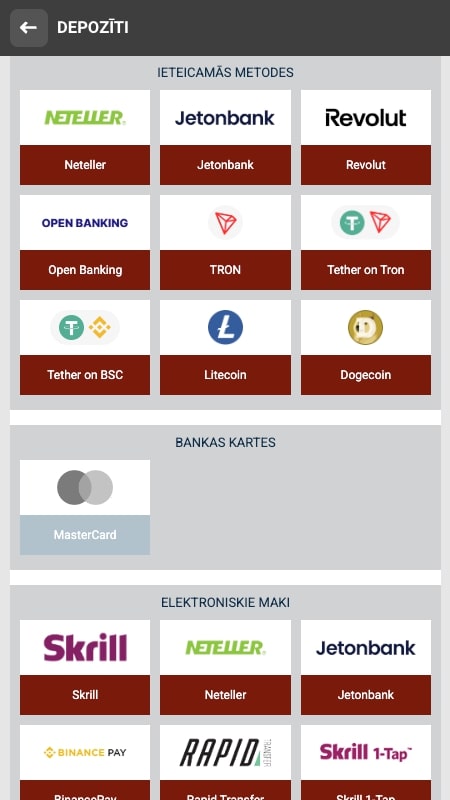 MobilÄ versija un Android lietotne ļauj veikt maksÄjumus tieÅ”i no telefona. SavukÄrt, bonusu aktivizÄcija var bÅ«t atkarÄ«ga no maksÄjuma metodes. PiemÄram, kripto maksÄjumi neaktivizÄ Free Bet bonusu.