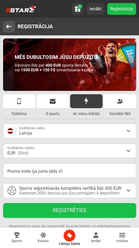IzvÄlieties vienu no Äetriem reÄ£istrÄcijas veidiem: ar e-pastu, tÄlruÅa numuru, sociÄlo tÄ«klu profilu vai vienas klikŔķa metodi. Aizpildiet prasÄ«tos laukus (lietotÄjvÄrds, parole, valÅ«ta, personas dati).