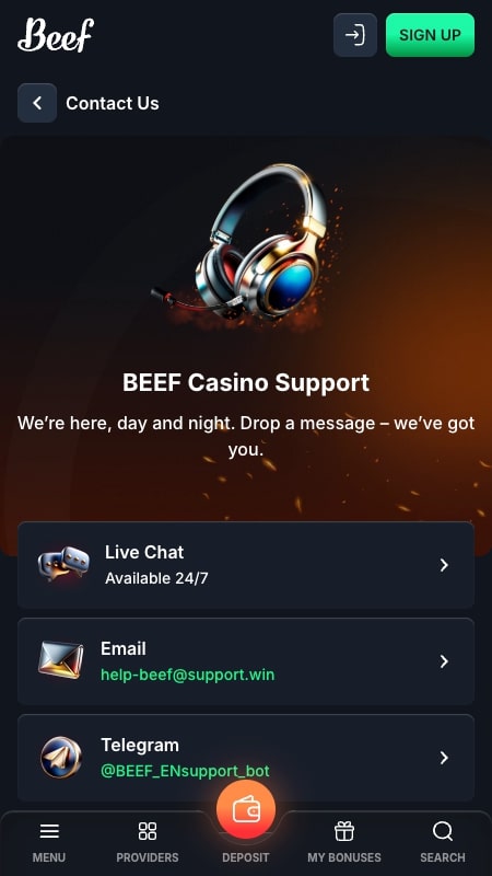 Beef totalizatora klientu atbalsts ir pieejams visu diennakti un piedāvā vairākus ērtus saziņas kanālus. Komanda atbild ātri un palīdz gan ar tehniskiem, gan maksājumu vai bonusu jautājumiem.