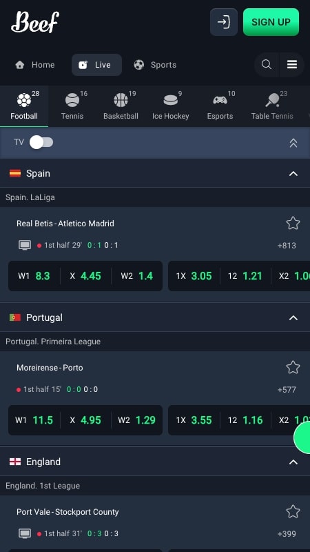Live sadaļa ir viens no Beef totalizatora galvenajiem plusiem. Tā piedāvā reāllaika koeficientu atjauninājumus, statistiku un dinamisku likmju izvēlni ar plašu sporta klāstu. Futbola, tenisa un e-sporta notikumiem pieejama grafiskā mača vizualizācija, savukārt populārākajos e-sporta turnīros (CS2, Dota 2, LoL) ir iebūvēta tiešraides straumēšana.
