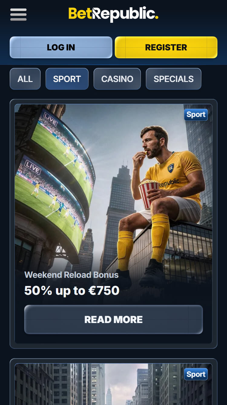 BetRepublic ir starptautisks sporta totalizators ar plašu sporta veidu klāstu, tostarp futbolu, basketbolu, tenisu, hokeju, zirgu skriešanās sacīkstēm, e-sportu un virtuālo sportu. Platforma piedāvā live likmes, Bet Builder funkciju, Accumulator Boost līdz 100% un regulārus sporta bonusus. Minimālais depozīts €10 padara totalizatoru pieejamu plašam lietotāju lokam, savukārt izmaksu limiti līdz €5 000 vienā darījumā atbilst tirgus standartam. Mobilā versija ir pilnībā pielāgota lietošanai pārlūkprogrammā un nodrošina pilnu funkcionalitāti arī viedtālruņos.